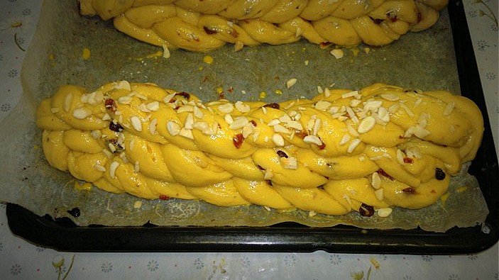 Hotovou vánočku potřeme rozšlehaným vejcem a posypeme mandlemi.